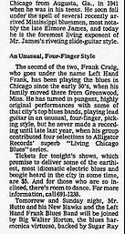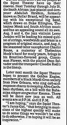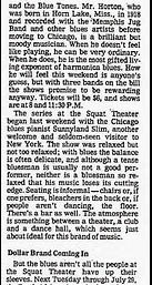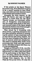 New York Times, July 20,1979 pg.C3 by Robert Palmer If the people at the Squat Theater have their way, West 23d Street is going to be a major location to hear blues, jazz, new rock and new classical music in the weeks and months to come. Normally the little theater, at 256 West 23d Street, just east of Eighth Avenue, is home base for the Squat Theater troupe, an irreverent collective of Hungarian actor-dramatists. But the troupe tours much of the year, and recently some of the Squat people decided the former site of Cavanaugh's Restaurant was going to waste. They struck up a friendship with Rasa Artists, a growing enterprise that has been primarily devoted to managing the careers of jazz musicians such as Sam Rivers and Leroy Jenkins, but bas also been bringing a few blues artists of unusual merit into Manhattan. The result is already New York's most promising new blues' and jazz concert series. The folks at Squat and Rasa say it's just the beginning. Tonight at 8:30 and 11 P.M., too Chicago blues guitarists who play exciting dance music in a 1950's juke-joint idiom will be performing at the Squat Theater. J. B. Hutto, known for two fine albums on the Delmark label, moved to Chicago from Augusta, Ga., in 1941 when he was in his teens. He soon fell under the spell of several recently arrived Mississippi bluesmen, most notably the late Elmore James, and today he is the foremost living exponent of Mr. James's riveting slide-guitar style. An Unusual, Four-FingerStyle The second of the two, Frank Craig, who goes under the name Left Hand Frank, has been playing the blues in Chicago since the early 50's, when his family moved there from Greenwood, Miss. He has turned in pungent, highly original performances with some of that city's top blues bands, playing lead guitar in an unusual, four-finger, picking style, but he never made a recording until late last year, when his group contributed four selections to Alligator Records' superb "Living Chicago Blues" series. Tickets for tonight's shows, which promise to deliver some of the earthiest, most idiomatic electric blues and boogie heard in the city in some time, are $5. And for those who are so inclined, there's room to dance. For more information, call 691-l238. Tomorrow and Sunday night, Mr. Hutto and his New Hawks and the Left Hand Frank Blues Band will be joined by Big Walter Horton, the blues harmonica virtuoso, backed by Sugar Ray and the Blue Tones. Mr. Horton, who was born in Horn Lake, Miss., in 1918 and recorded with the Memphis Jug Band and other blues artists before moving to Chicago, is a brilliant but moody musician. When he doesn't feel like playing, he can be very ordinary. When he does, he is the most gifted living exponent of harmonica blues. How he will feel this weekend is anyone's guess, but with three bands on the bill the shows promise to be rewarding anyway. Tickets will be $6, and shows are at 8 and 11:30 P.M. The series at the Squat Theater began last weekend with the Chicago blues pianist Sunnyland Slim, another welcome and seldom-seen visitor to New York. The show was relaxed but not too relaxed; with blues the balance is often delicate, and although a tense bluesman is usually not a good performer, neither is a bluesman so relaxed that his music loses its cutting edge. Seating is informal -chairs or, if one prefers, bleachers in the back or, if people aren't dancing, the floor. There's a bar as well. The atmosphere is something between a theater, a club and a dance ball, which seems just about ideal for this brand of music. Dollar Brand Coming In But the blues aren't all the people at the Squat Theater have up their sleeves. Next Tuesday through July 29, the South African jazz pianist and composer Abdullah Ibrahim formerly known as Dollar Brand, will be appearing with his exceptional big band, which draws on Duke Ellington,Thelonious Monk and South African music and has an appealing sound all its own. Aug. 3 and 4, the jazz violinist Leroy Jenkins will be leading his mixed quintet of strings, woodwinds and brass in a program of original music, and Aug. 5, the seasoned tenor saxophonist Charlie Rouse, a mainstay of Thelonious Monk's band for many years, brings in his Brazilian flavored group, Cinammon Flower, with the pianist Dom Salvador and the trumpeter Claudio Roditi in the lineup. Later next month the Squat Theater hopes to present the Golden Eagles, members of a black Mardi Gras society from New Orleans, who sing call-and-response chants to swaying Afro-Caribbean rhythms, on a bill with the Bahamian singer-songwriter Exuma. There will be more new jazz as well. All events are at 9 P.M. and 11 P.M. "I am hoping," says the Squat Theater's Janos Gat, "that bringing in musicians of the highest quality will make us do some things we wouldn't be able to do otherwise. I'm hoping it will be an inspiration." |